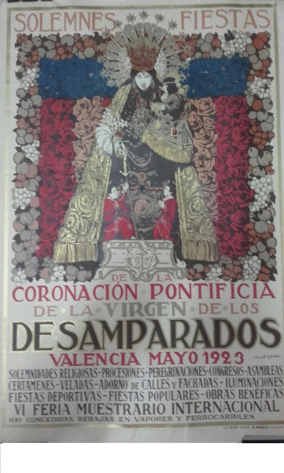 CARTEL en papel FIESTAS CORONACIÓN VIRGEN DESAMPARADOS , VALENCIA MAYO 1923