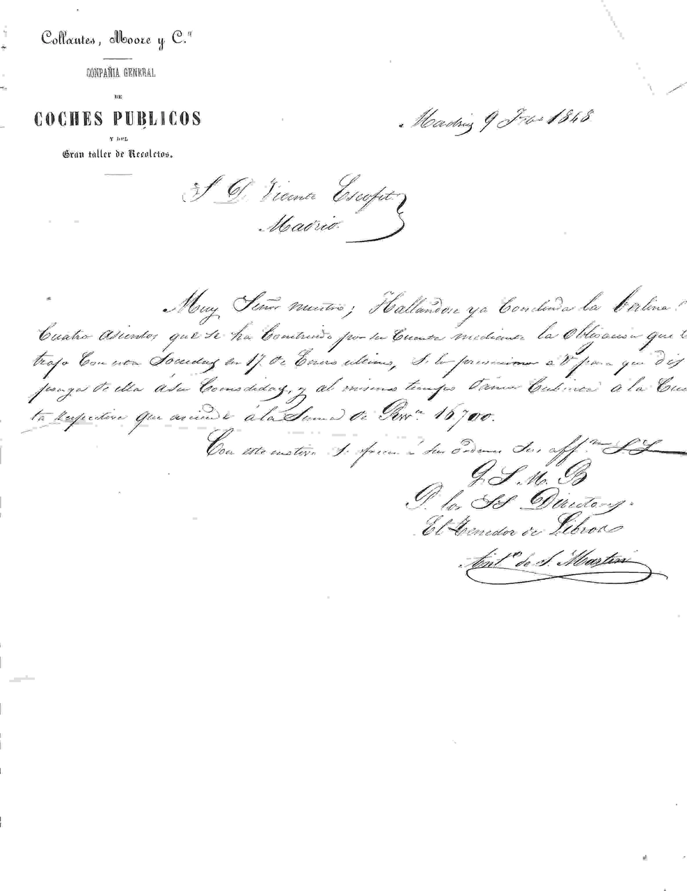carta 1848 a Vicente Escofet de Collantes Morey y Cia compañia de coches publicos..,siglo XIX, 2 hojas, doblada por la mitad , no está circulada ni lleva cuño