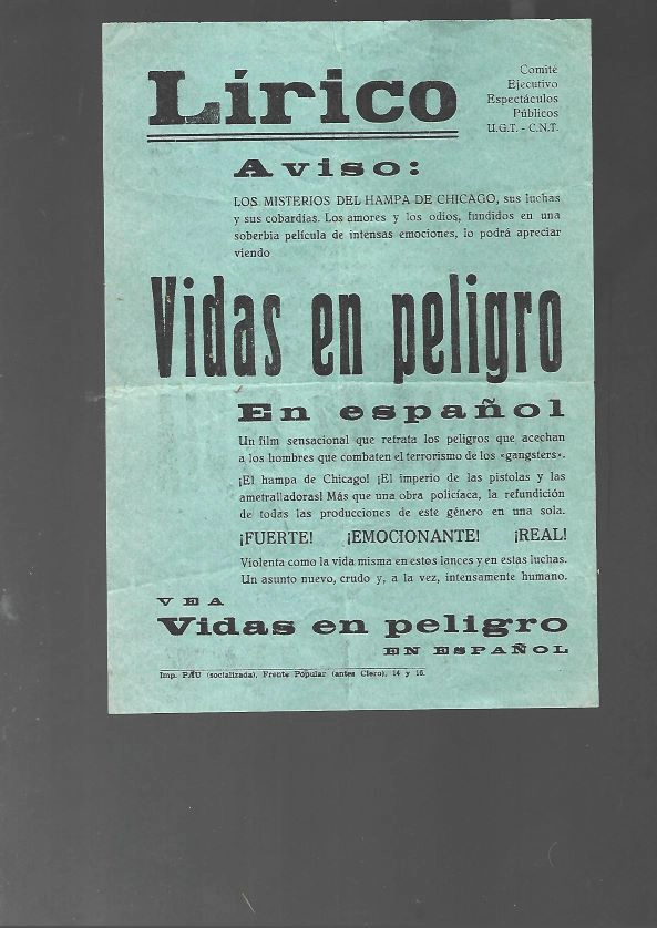 CARTEL CINE LIRICO VALENCIA guerra civil comite U.G.T. C.N.T. 22×15 cm doblado por la mitad
