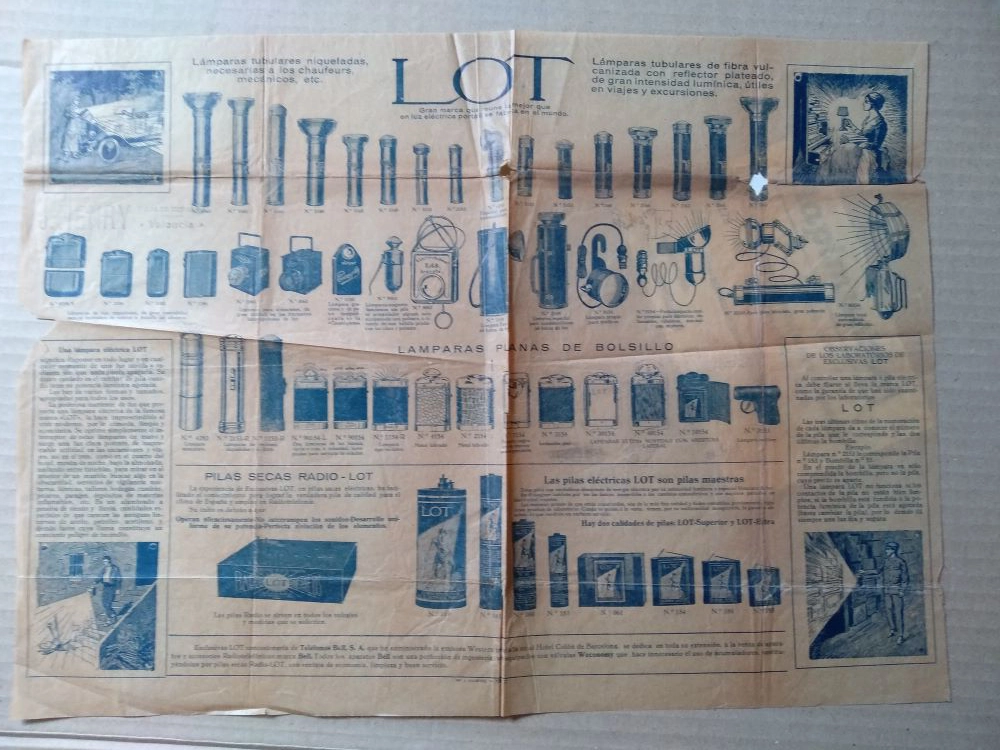 cartel LOT marca de aparatos y elementos en luz electrica portatil , linternas, lamparas, pilas secas, pilas electricas… 36x 42 cm,