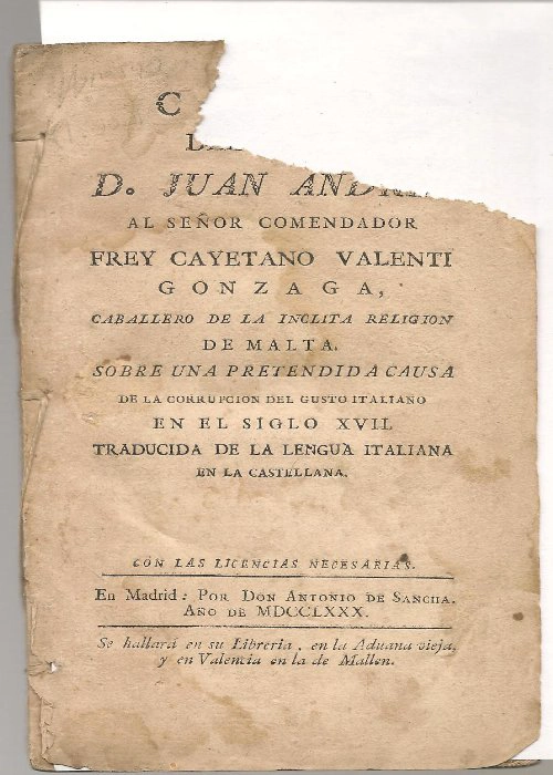 …. D. JUAN ANDRES AL SEÑOR COMENDADOR FRAY CAYETANO VALENTI GONZAGA CABALLERO DE LA INCLITA RELIGION DE MALTA SOBRE UNA PRETENDIDA CAUSA DE LA CORRUPCION DEL GUSTO ITALIANO EN EL S. XVII