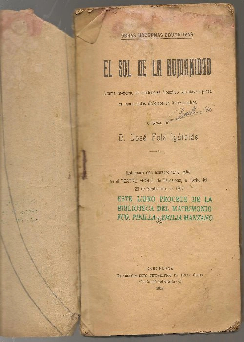 EL SOL DE LA HUMANIDAD drama estrenado en teatro Apolo de Barcelona en 1910