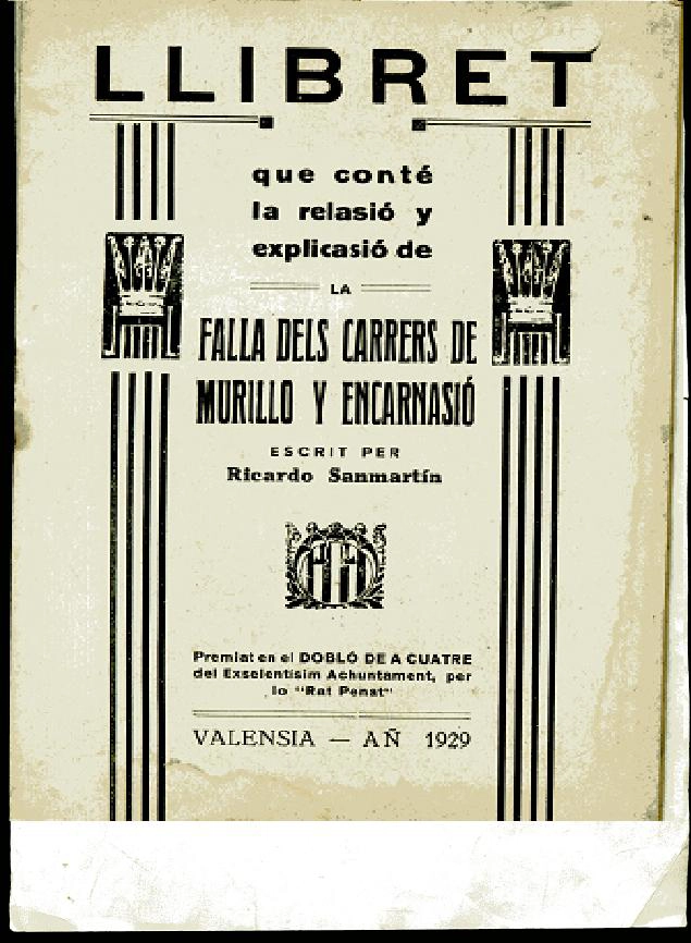 LLIBRET QUE CONTÉ LA RELASIÓ Y EXPLICASIÓ DE LA FALLA DELS CARRES DE MURILLO Y ENCARNASIÓ, escrit per RICARDO SANMARTIN, Valencia 1929 , 11x 16 cm.