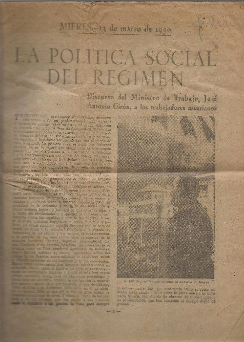 MIERES 13 MARZO 1950, LA POLITICA SOCIAL DEL REGIMEN, discurso del Ministro de Trabajo JOSE ANTONIO GIRON a los trabajadores asturianos