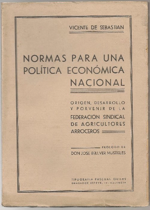 NORMAS PARA UNA POLITICA NACIONAL. ORIGEN, DESARROLLO Y PORVENIR DE LA FEDERACION SINDICAL DE AGRICULTORES ARROCEROS.Prol. J:Bellver Mustieles.